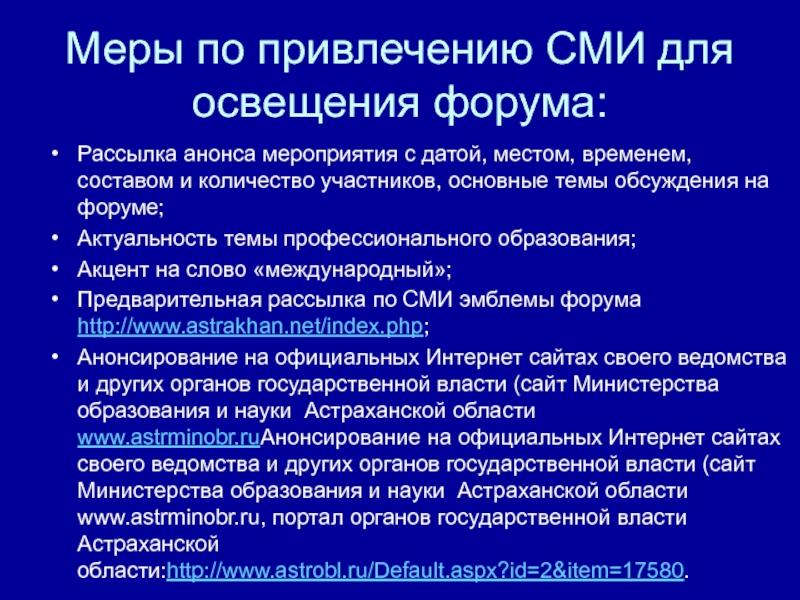 Анонсирование на официальных Интернет сайтах своего ведомства и других органов государственной власти (сайт Министерства образования и науки Астраханской области www.astrminobr.ruАнонсирование на официальных Интернет сайтах своего ведомства и других органов государственной власти (сайт Министерства образования и науки Астраханской области www.astrminobr.ru, портал органов государственной власти Астраханской области:http://www.astrobl.ru/Default.aspx?id=2&item=17580.