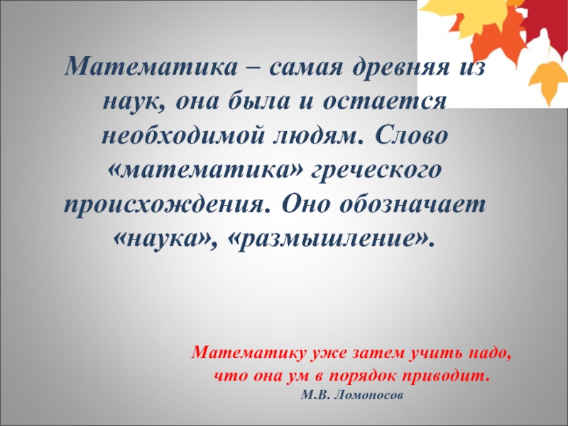 Математика – самая древняя из наук, она была и остается необходимой людям. Слово «математика» греческого происхождения. Оно обозначает «наука», «размышление».