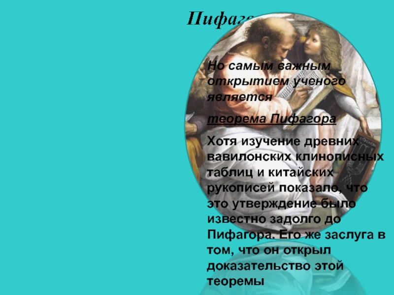 клинописных таблиц и китайских рукописей показало, что это утверждение было известно задолго до Пифагора. Его же заслуга в том, что он открыл доказательство этой теоремы