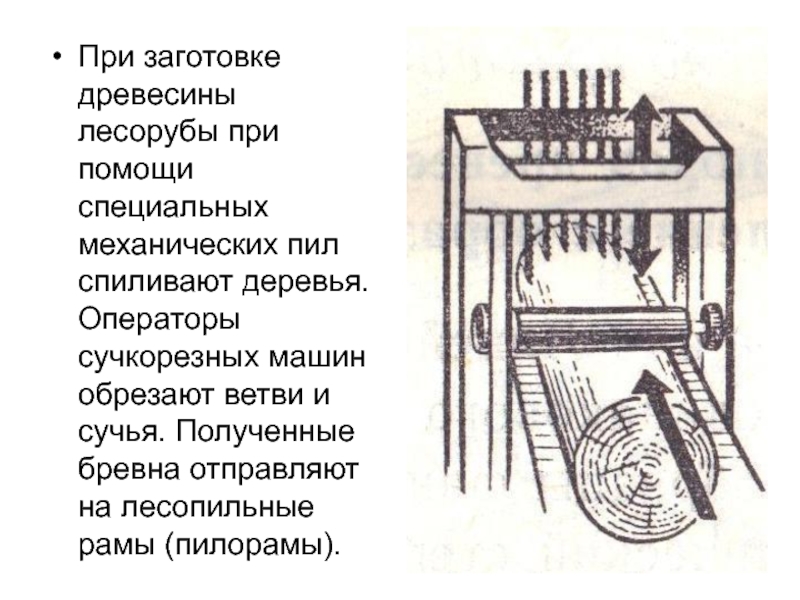 Слайд 4При заготовке древесины лесорубы при помощи специальных механических пил спиливают деревья.
