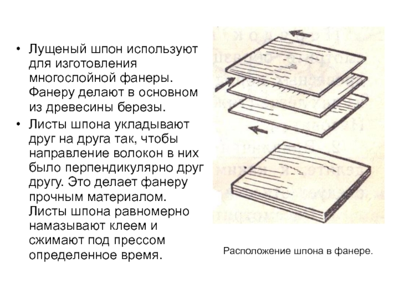 Слайд 16Лущеный шпон используют для изготовления многослойной фанеры. Фанеру делают в основном