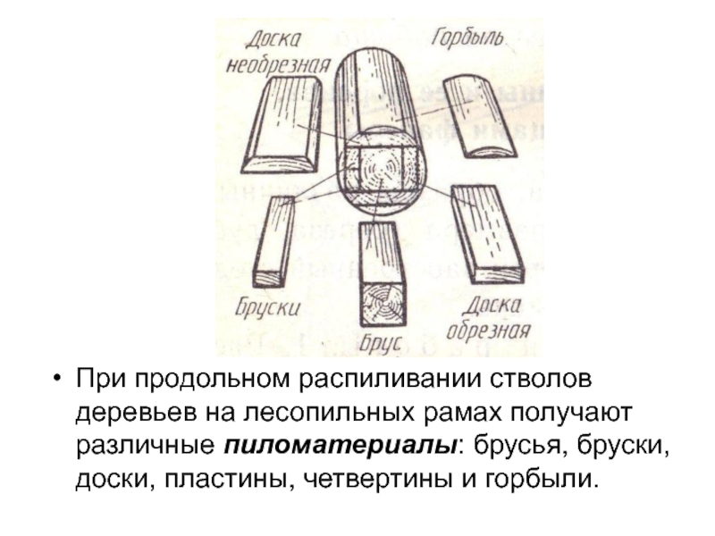 Слайд 5При продольном распиливании стволов деревьев на лесопильных рамах получают различные пиломатериалы: