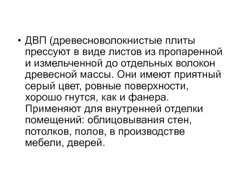 Слайд 18ДВП (древесноволокнистые плиты прессуют в виде листов из пропаренной и измельченной