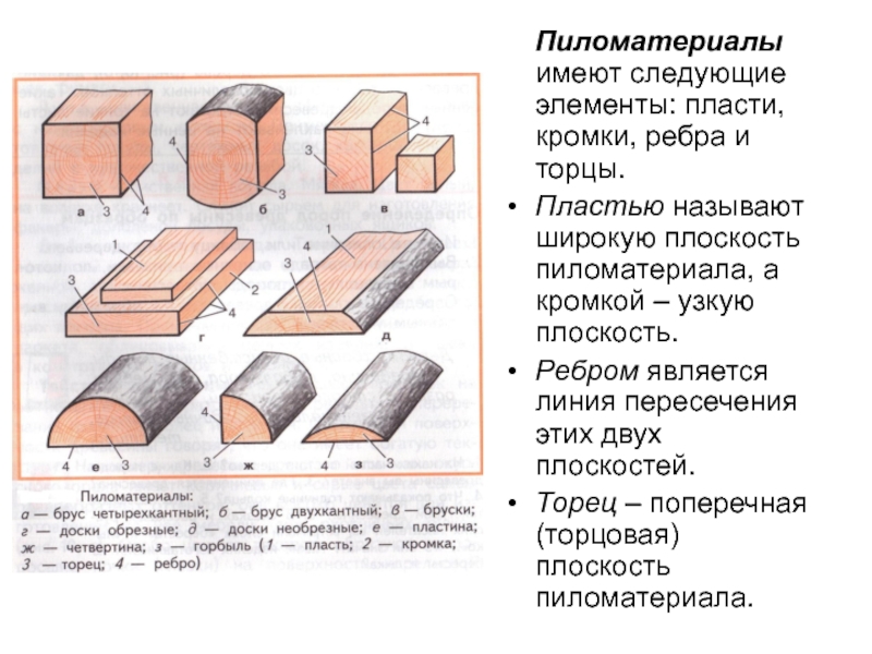 Слайд 11 Пиломатериалы имеют следующие элементы: пласти, кромки, ребра и торцы.
