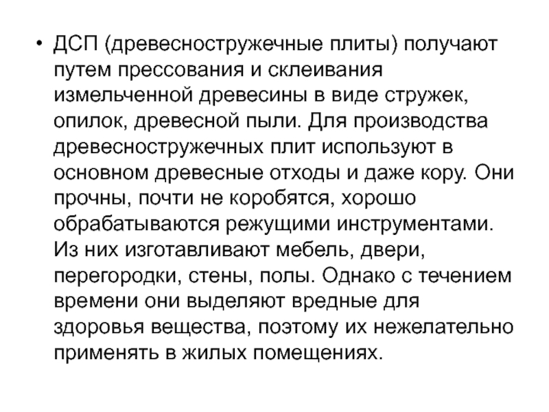 виде стружек, опилок, древесной пыли. Для производства древесностружечных плит используют в основном древесные отходы и даже кору. Они прочны, почти не коробятся, хорошо обрабатываются режущими инструментами. Из них изготавливают мебель, двери, перегородки, стены, полы. Однако с течением времени они выделяют вредные для здоровья вещества, поэтому их нежелательно применять в жилых помещениях.