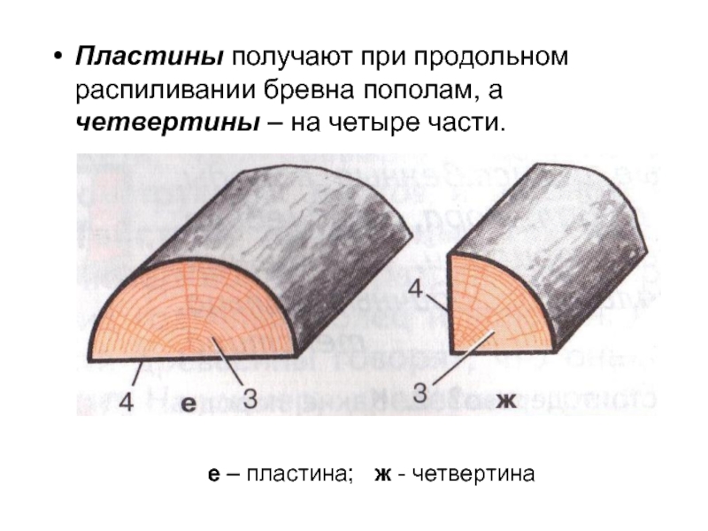 Слайд 9Пластины получают при продольном распиливании бревна пополам, а четвертины – на