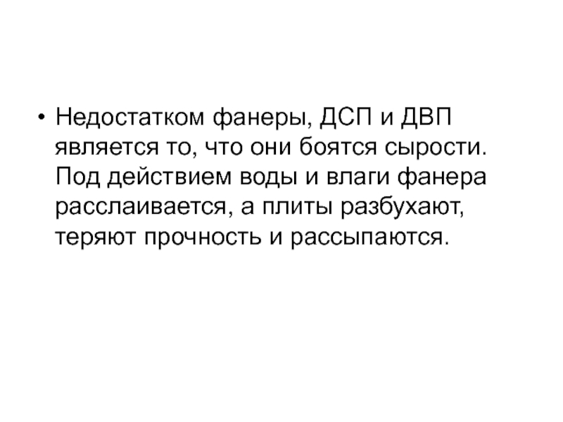 Слайд 19Недостатком фанеры, ДСП и ДВП является то, что они боятся сырости.