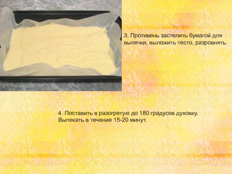 3. Противень застелить бумагой для выпечки, выложить тесто, разровнять.