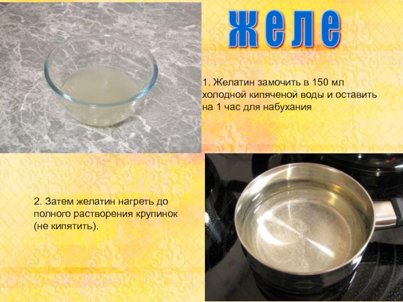 2. Затем желатин нагреть до полного растворения крупинок (не кипятить).