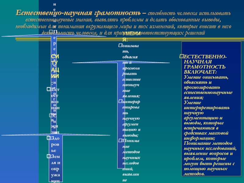 Естественно-научная грамотность – способность человека использовать естественнонаучные знания, выявлять проблемы и делать обоснованные выводы, необходимые для понимания окружающего мира и тех изменений, которые вносит в него деятельность человека, и для принятия соответствующих решений
