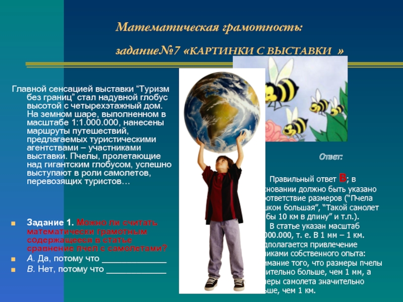 В статье указан масштаб 1:1.000.000, т. е. В 1 мм – 1 км. Предполагается привлечение учениками собственного опыта: понимание того, что размеры пчелы значительно больше, чем 1 мм, а размеры самолета значительно меньше, чем 1 км.