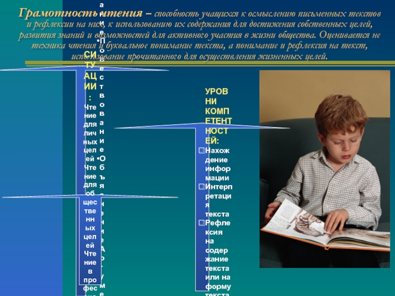 Грамотность чтения – способность учащихся к осмыслению письменных текстов и рефлексии на них, к использованию их содержания для достижения собственных целей, развития знаний и возможностей для активного участия в жизни общества. Оценивается не техника чтения и буквальное понимание текста, а понимание и рефлексия на текст, использование прочитанного для осуществления жизненных целей.