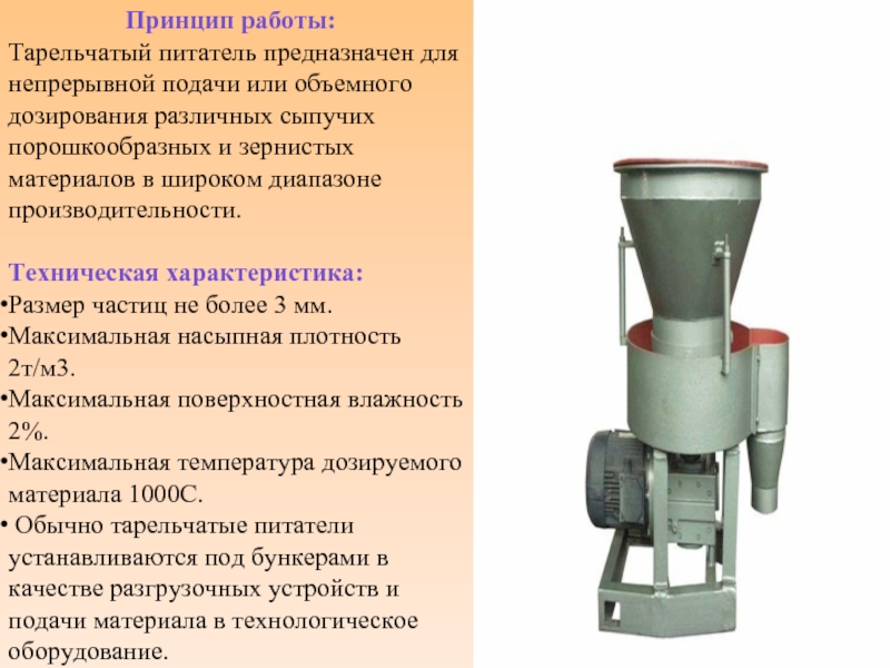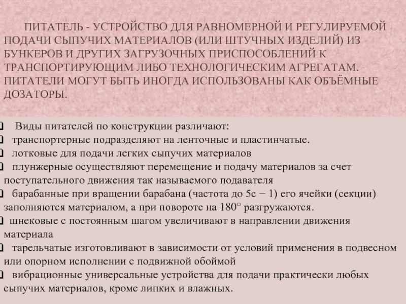 вибрационные универсальные устройства для подачи практически любых сыпучих материалов, кроме липких и влажных.