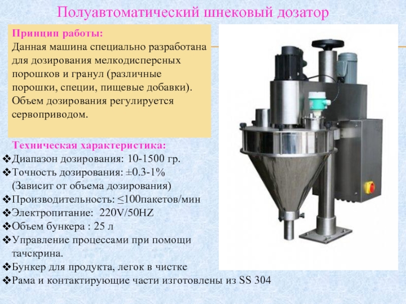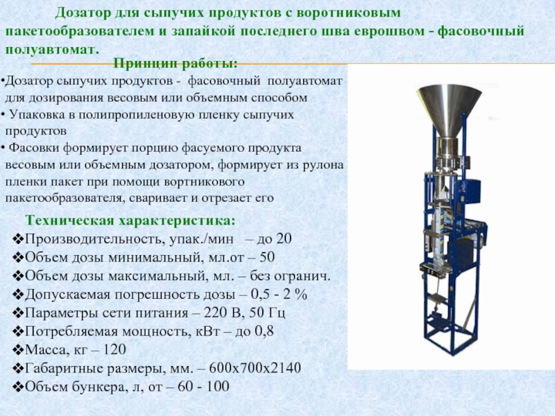 Дозатор для сыпучих продуктов с воротниковым пакетообразователем и запайкой последнего шва еврошвом - фасовочный полуавтомат.