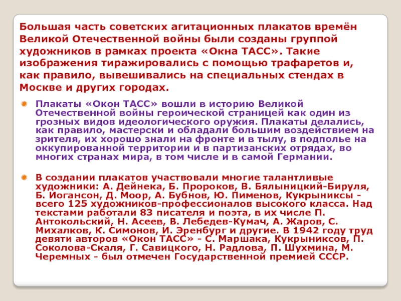 Большая часть советских агитационных плакатов времён Великой Отечественной войны были созданы группой художников в рамках проекта «Окна ТАСС». Такие изображения тиражировались с помощью трафаретов и, как правило, вывешивались на специальных стендах в Москве и других городах.