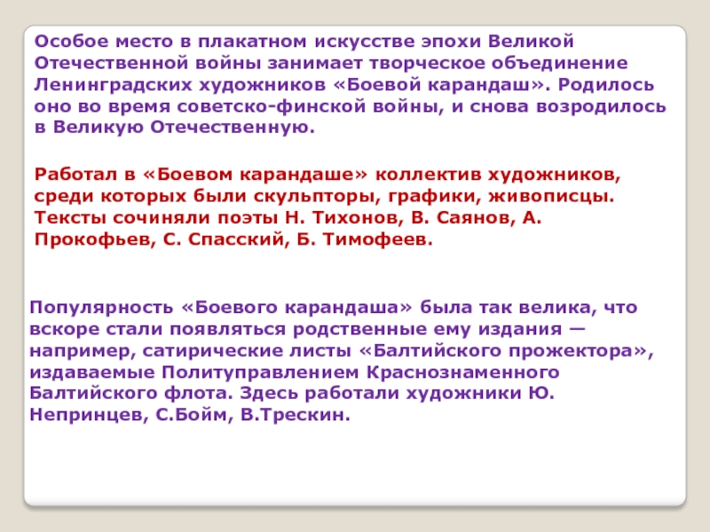 объединение Ленинградских художников «Боевой карандаш». Родилось оно во время советско-финской войны, и снова возродилось в Великую Отечественную.