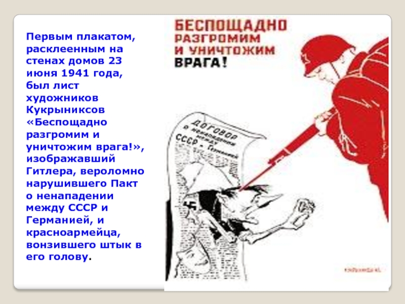 лист художников Кукрыниксов «Беспощадно разгромим и уничтожим врага!», изображавший Гитлера, вероломно нарушившего Пакт о ненападении между СССР и Германией, и красноармейца, вонзившего штык в его голову.