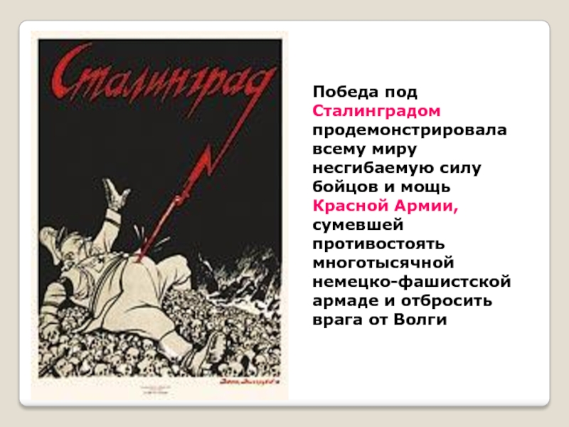 Слайд 36Победа под Сталинградом продемонстрировала всему миру несгибаемую силу бойцов и мощь