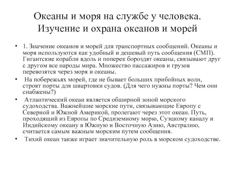 1. Значение океанов и морей для транспортных сообщений. Океаны и моря используются как удобный и дешевый путь сообщения (СМП). Гигантские корабли вдоль и поперек бороздят океаны, связывают друг с другом все народы мира. Множество пассажиров и грузов перевозятся через моря и океаны.