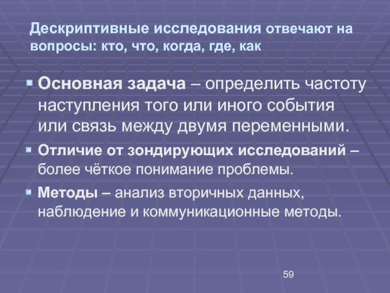 Слайд 9Дескриптивный тип исследования – требует точных формулировок вопросов: