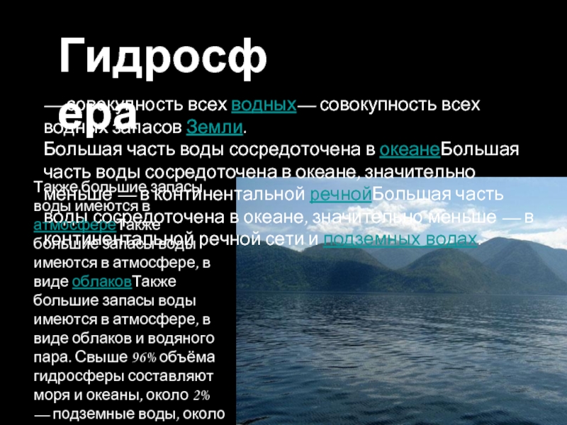 Также большие запасы воды имеются в атмосфереТакже большие запасы воды имеются в атмосфере, в виде облаковТакже большие запасы воды имеются в атмосфере, в виде облаков и водяного пара. Свыше 96% объёма гидросферы составляют моря и океаны, около 2% — подземные воды, около 2% — льды и снега, около 0,02% — поверхностные воды суши. Часть воды находится в твёрдом состоянии в виде ледниковТакже большие запасы воды имеются в атмосфере, в виде облаков и водяного пара. Свыше 96% объёма гидросферы составляют моря и океаны, около 2% — подземные воды, около 2% — льды и снега, около 0,02% — поверхностные воды суши. Часть воды находится в твёрдом состоянии в виде ледников, снежного покроваТакже большие запасы воды имеются в атмосфере, в виде облаков и водяного пара. Свыше 96% объёма гидросферы составляют моря и океаны, около 2% — подземные воды, около 2% — льды и снега, около 0,02% — поверхностные воды суши. Часть воды находится в твёрдом состоянии в виде ледников, снежного покрова и в вечной мерзлотеТакже большие запасы воды имеются в атмосфере, в виде облаков и водяного пара. Свыше 96% объёма гидросферы составляют моря и океаны, около 2% — подземные воды, около 2% — льды и снега, около 0,02% — поверхностные воды суши. Часть воды находится в твёрдом состоянии в виде ледников, снежного покрова и в вечной мерзлоте, представляя собой криосферу.