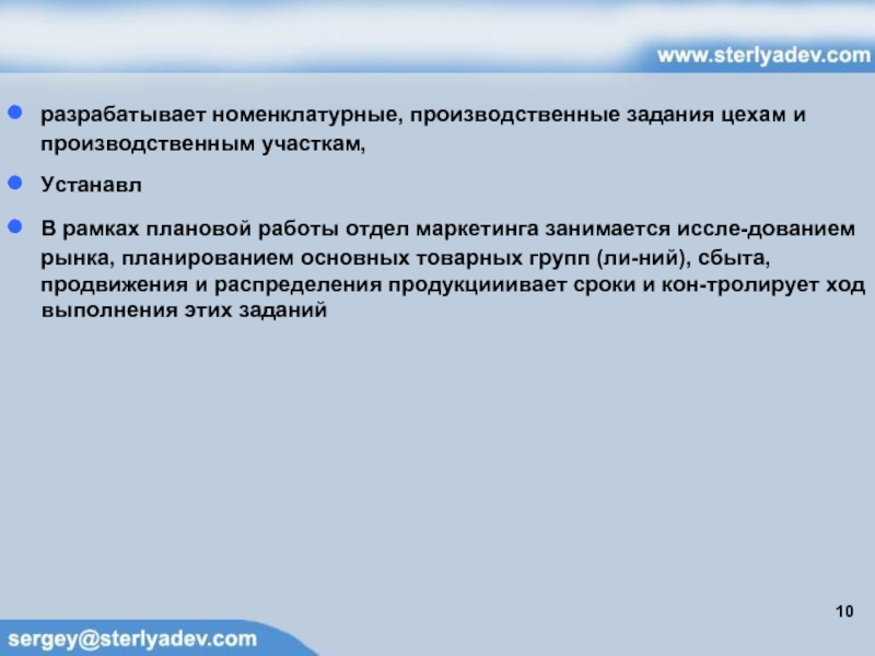 работы отдел маркетинга занимается исследованием рынка, планированием основных товарных групп (линий), сбыта, продвижения и распределения продукцииивает сроки и контролирует ход выполнения этих заданий