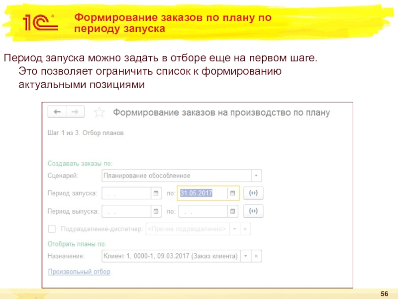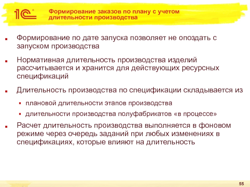 Слайд 55Формирование заказов по плану с учетом длительности производства
