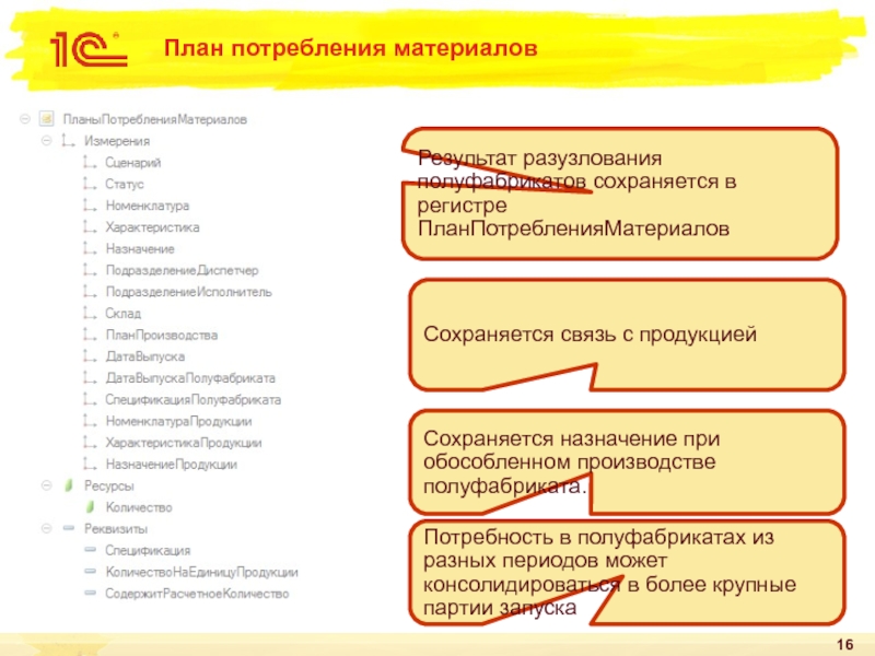 Результат разузлования полуфабрикатов сохраняется в регистре ПланПотребленияМатериалов