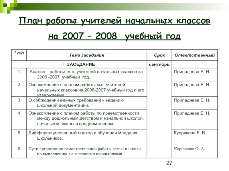 Слайд 27План работы учителей начальных классов на 2007 – 2008 учебный год