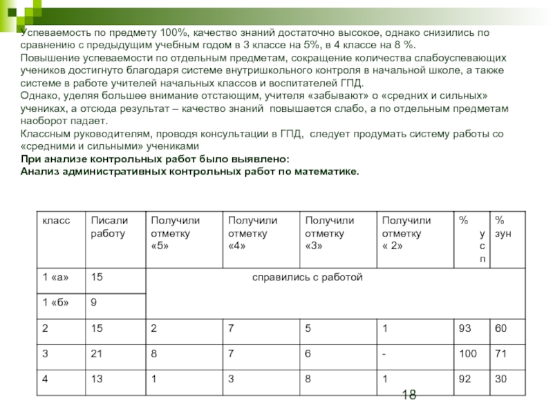 Повышение успеваемости по отдельным предметам, сокращение количества слабоуспевающих учеников достигнуто благодаря системе внутришкольного контроля в начальной школе, а также системе в работе учителей начальных классов и воспитателей ГПД.
