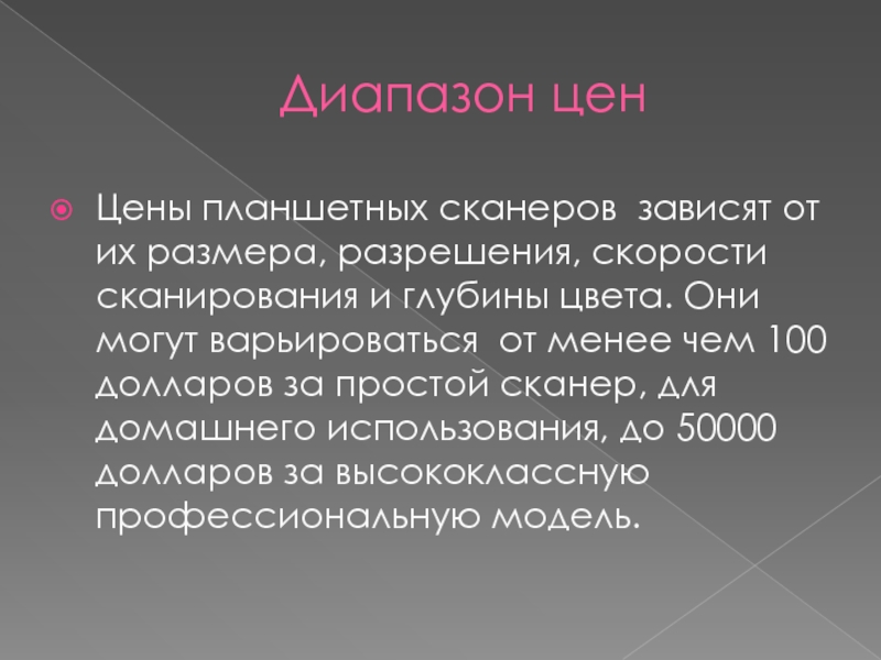 и глубины цвета. Они могут варьироваться от менее чем 100 долларов за простой сканер, для домашнего использования, до 50000 долларов за высококлассную профессиональную модель.