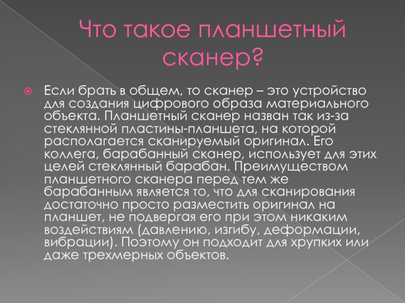 устройство для создания цифрового образа материального объекта. Планшетный сканер назван так из-за стеклянной пластины-планшета, на которой располагается сканируемый оригинал. Его коллега, барабанный сканер, использует для этих целей стеклянный барабан. Преимуществом планшетного сканера перед тем же барабанным является то, что для сканирования достаточно просто разместить оригинал на планшет, не подвергая его при этом никаким воздействиям (давлению, изгибу, деформации, вибрации). Поэтому он подходит для хрупких или даже трехмерных объектов.