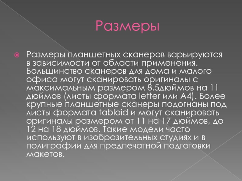 для дома и малого офиса могут сканировать оригиналы с максимальным размером 8.5дюймов на 11 дюймов (листы формата letter или А4). Более крупные планшетные сканеры подогнаны под листы формата tabloid и могут сканировать оригиналы размером от 11 на 17 дюймов, до 12 на 18 дюймов. Такие модели часто используют в изобразительных студиях и в полиграфии для предпечатной подготовки макетов.