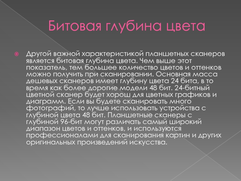 Другой важной характеристикой планшетных сканеров является битовая глубина цвета.