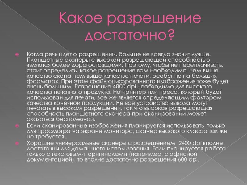 Хорошие универсальные сканеры с разрешением 2400 dpi вполне достаточны для домашнего использования. Если планируется работа только с текстовыми оригиналами (например, с офисной документацией), то вполне достаточно разрешения 600 dpi.
