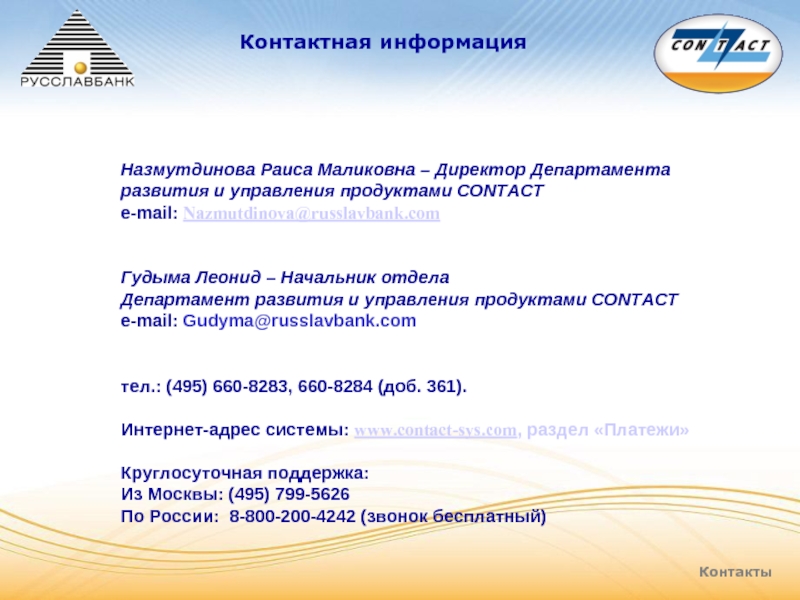 Партнеры Системы CONTACT – юридические лица, банки, использующие Сеть CONTACT для организации сбора платежей, заключившие с АКБ «РУССЛАВБАНК» (ЗАО) Соглашение, определяющее сроки, вид, объем предоставляемых услуг; размер/порядок выплаты вознаграждения, технологию взаимодействия.