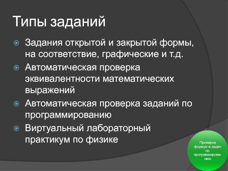 Задания открытой и закрытой формы, на соответствие, графические и т.д.