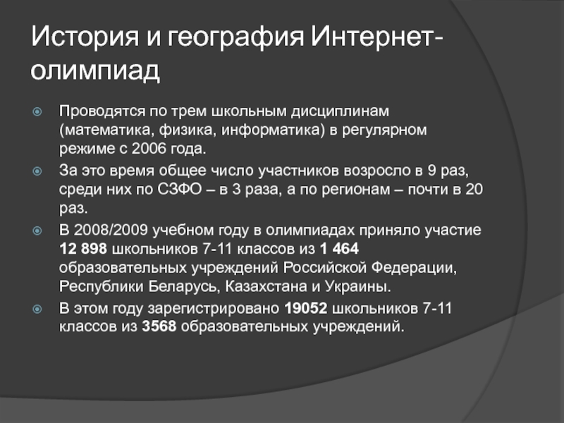 В 2008/2009 учебном году в олимпиадах приняло участие 12 898 школьников 7-11 классов из 1 464 образовательных учреждений Российской Федерации, Республики Беларусь, Казахстана и Украины.