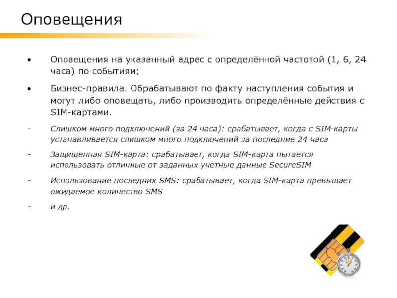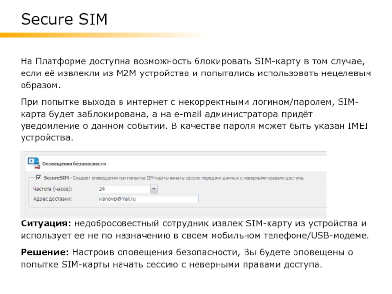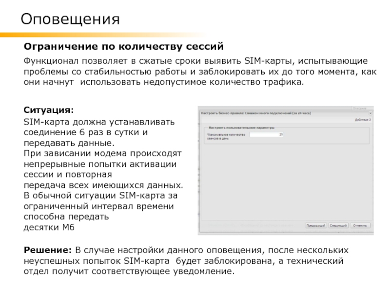 Решение: В случае настройки данного оповещения, после нескольких неуспешных попыток SIM-карта будет заблокирована, а технический отдел получит соответствующее уведомление.