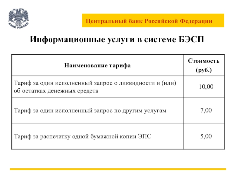 - услуги Банка России по проведению крупных, срочных платежей клиентов Банка России через систему БЭСП участниками системы БЭСП и обеспечению непрерывных в течение операционного дня системы БЭСП расчетов на валовой основе в режиме реального времени (далее – расчетная услуга Банка России в системе БЭСП)