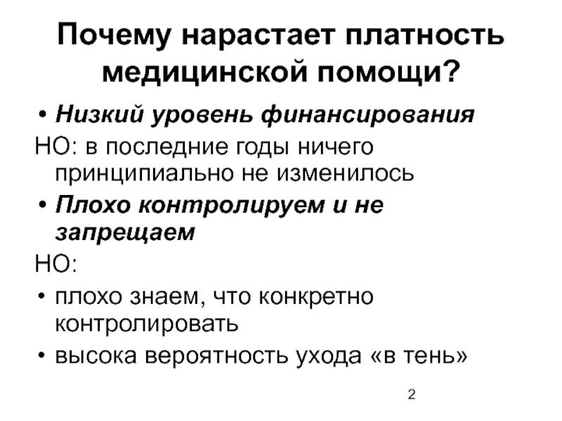 Слайд 3Почему нарастает платность медицинской помощи?-2