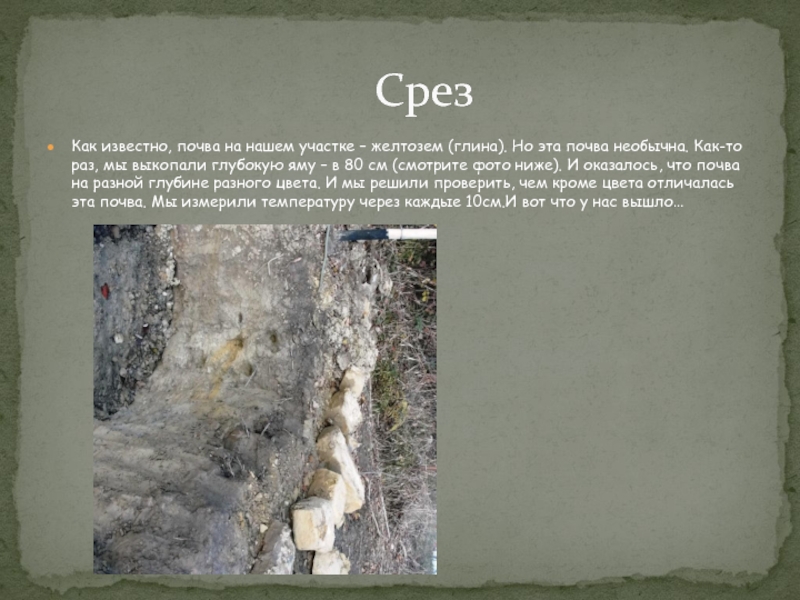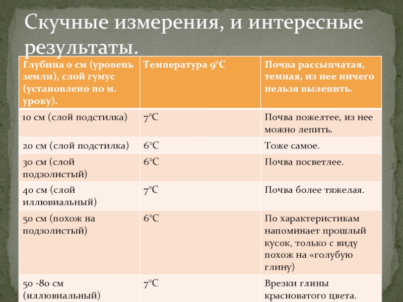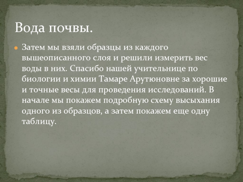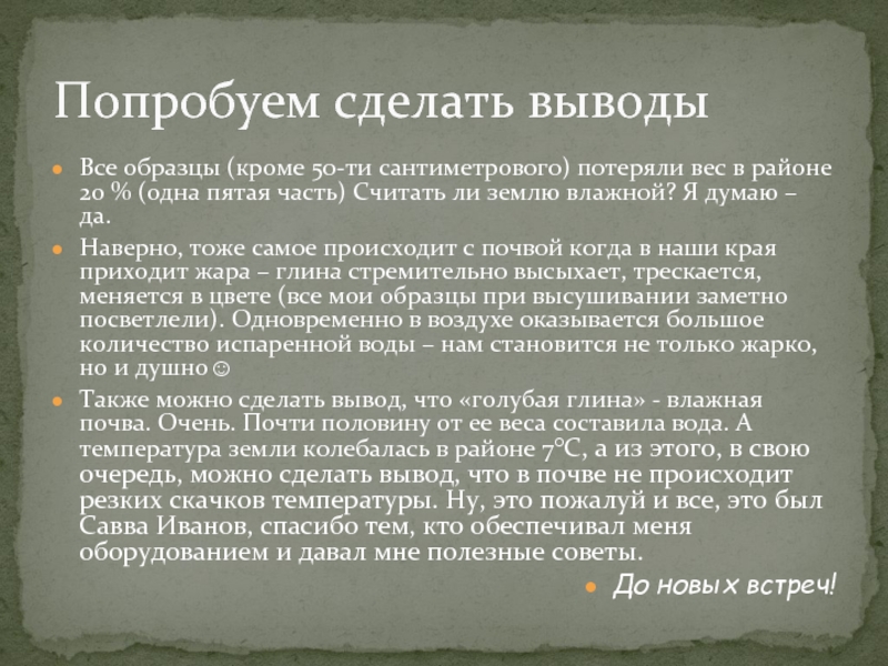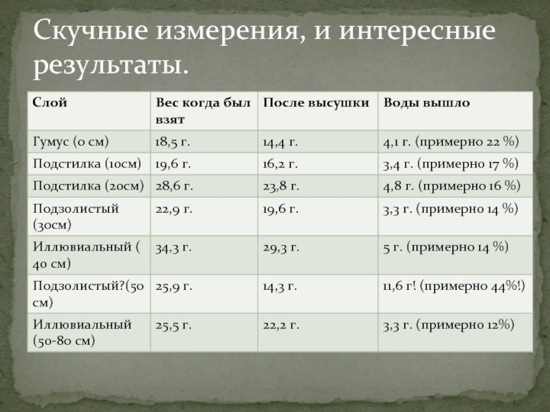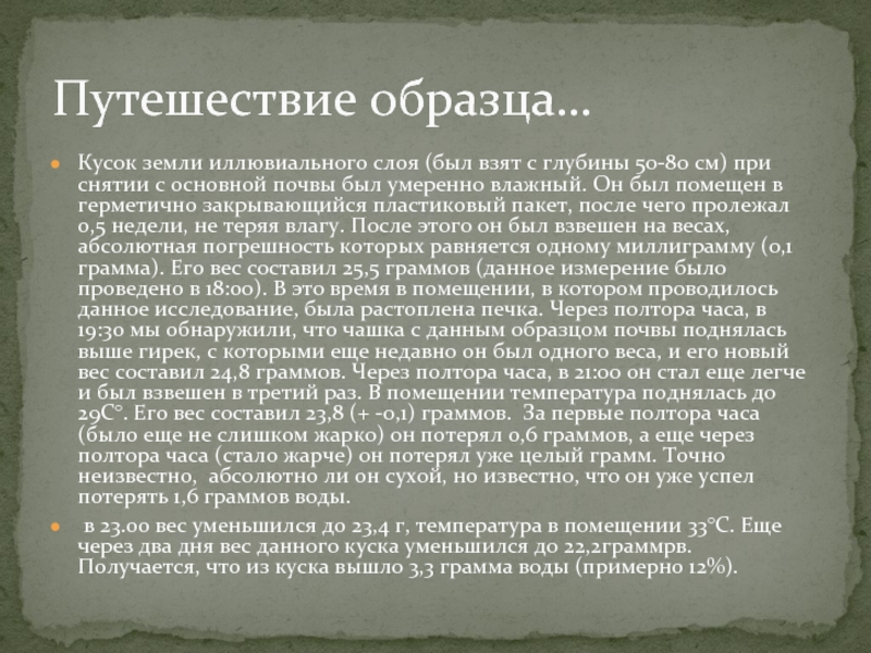 снятии с основной почвы был умеренно влажный. Он был помещен в герметично закрывающийся пластиковый пакет, после чего пролежал 0,5 недели, не теряя влагу. После этого он был взвешен на весах, абсолютная погрешность которых равняется одному миллиграмму (0,1 грамма). Его вес составил 25,5 граммов (данное измерение было проведено в 18:00). В это время в помещении, в котором проводилось данное исследование, была растоплена печка. Через полтора часа, в 19:30 мы обнаружили, что чашка с данным образцом почвы поднялась выше гирек, с которыми еще недавно он был одного веса, и его новый вес составил 24,8 граммов. Через полтора часа, в 21:00 он стал еще легче и был взвешен в третий раз. В помещении температура поднялась до 29C°. Его вес составил 23,8 (+ -0,1) граммов. За первые полтора часа (было еще не слишком жарко) он потерял 0,6 граммов, а еще через полтора часа (стало жарче) он потерял уже целый грамм. Точно неизвестно, абсолютно ли он сухой, но известно, что он уже успел потерять 1,6 граммов воды.