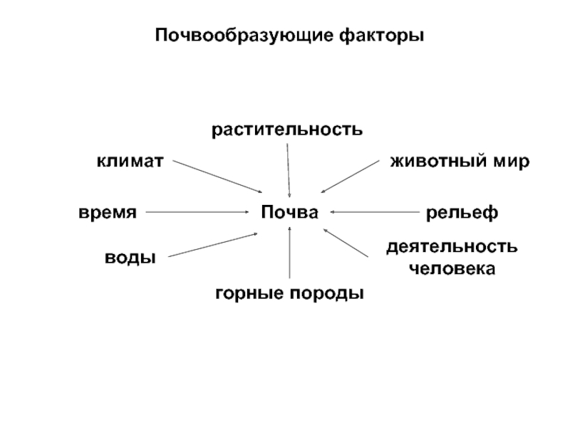 Почва растительность животный мир рельеф деятельность человека горные породы воды время климат Почвообразующие факторы. презентация