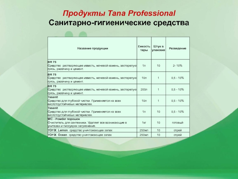 Слайд 7Продукты Tana Professional Санитарно-гигиенические средства