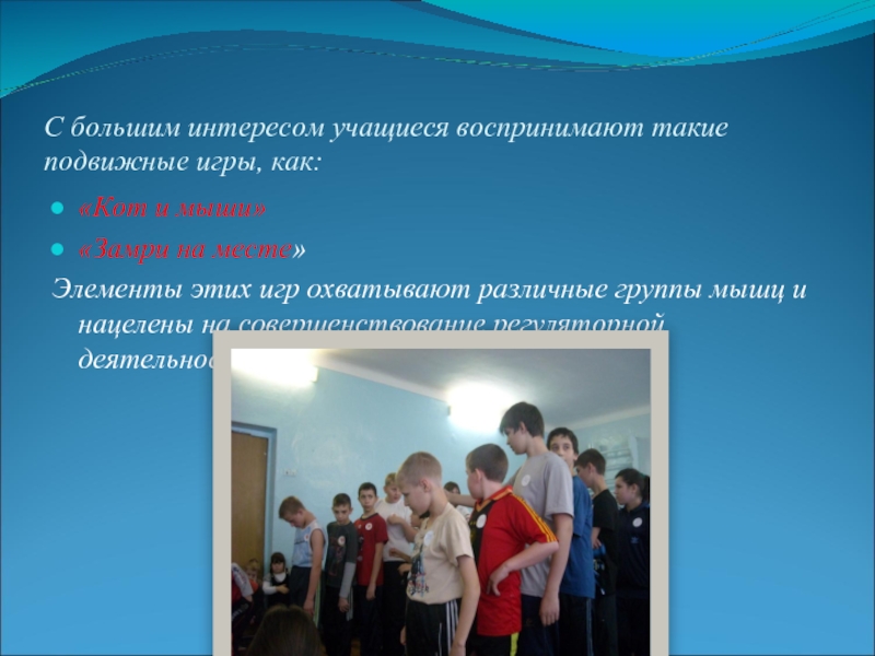 Необходимо использовать двигательные действия, заимствованные из различных видов спорта. Применение их в определенных сочетаниях способствуют расширению двигательных способностей школьников. К таким подвижным играм можно отнести игры: