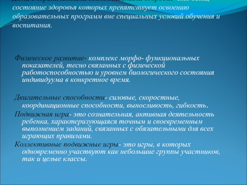Физическое развитие- комплекс морфо- функциональных показателей, тесно связанных с физической работоспособностью и уровнем биологического состояния индивидуума в конкретное время.