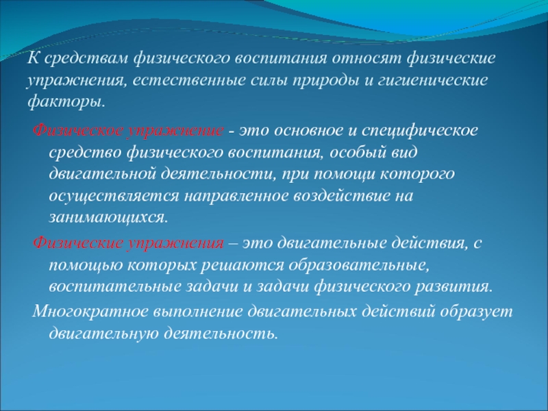 Физическое упражнение - это основное и специфическое средство физического воспитания, особый вид двигательной деятельности, при помощи которого осуществляется направленное воздействие на занимающихся.