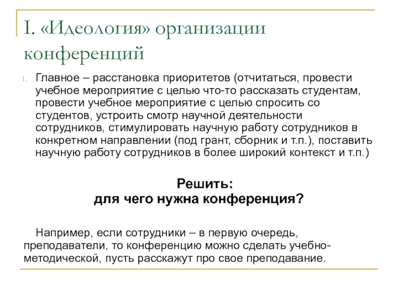 2.3. – решить, что раз формат все-таки есть и можно воспользоваться административным ресурсом (сверху приказано), использовать его максимально полезным образом. См. п. 1.: Для чего нужна конференция?