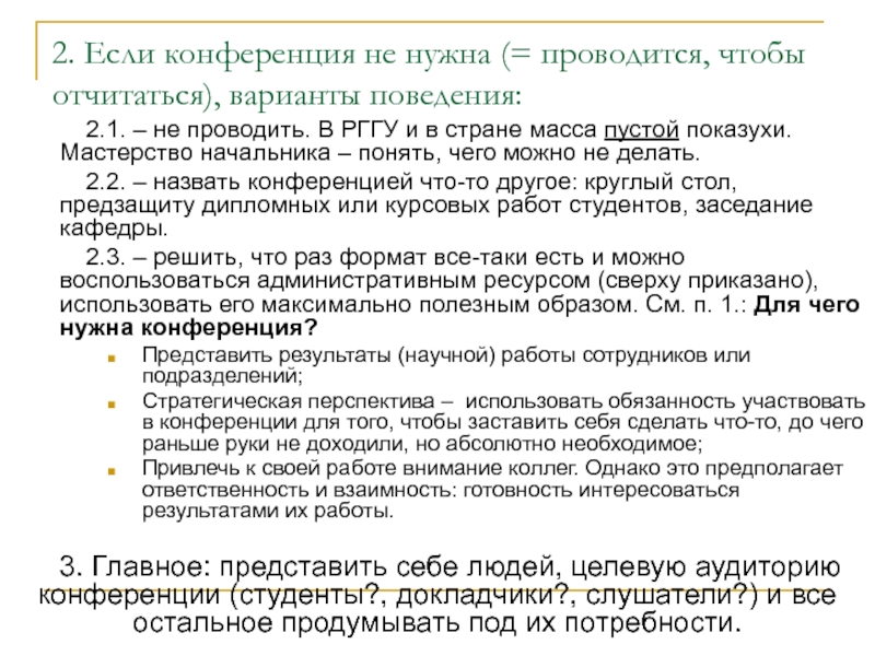 Слайд 52. Если конференция не нужна (= проводится, чтобы отчитаться), варианты поведения:
