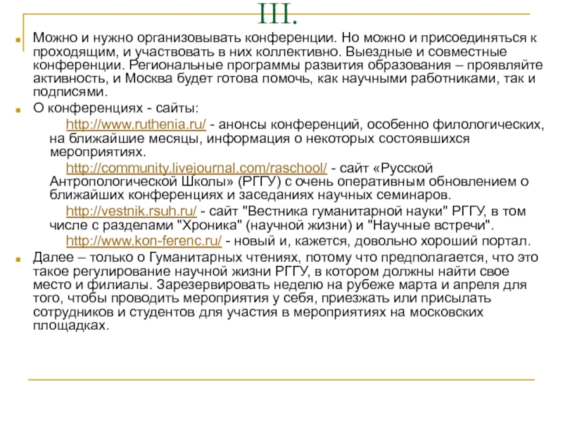 и участвовать в них коллективно. Выездные и совместные конференции. Региональные программы развития образования – проявляйте активность, и Москва будет готова помочь, как научными работниками, так и подписями.
